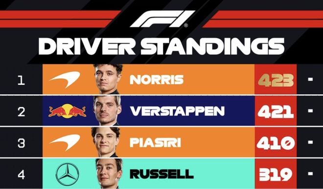 诺里斯最终以领先最接近的竞争对手马克斯·维斯塔潘2分的优势,赢得年度车手总冠军。
