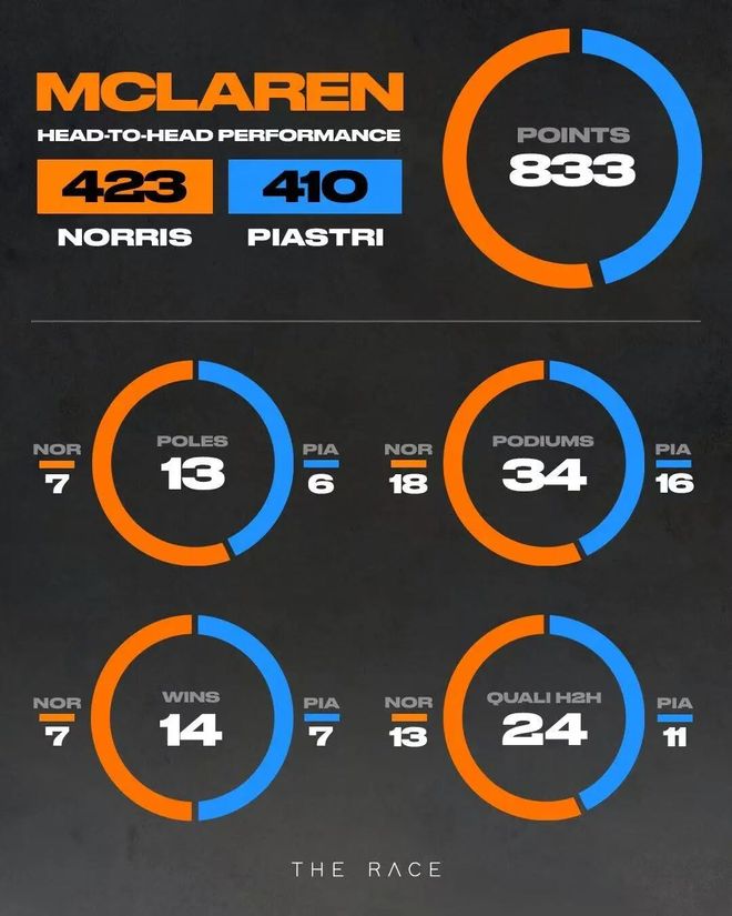 两人在正赛日的对决数据非常相似,诺里斯再次以13比10稍占上风,这其中不包括因技术违规被双双取消成绩的拉斯维加斯大奖赛。