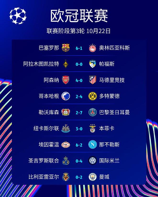 10月22日凌晨,欧冠联赛阶段第3轮第1比赛日结束9场争夺。本轮比赛上演进球狂潮,多场比赛打出高比分。巴塞罗那主场6-1大胜奥林匹亚科斯,卫冕冠军大巴黎7-2狂胜勒沃库森,埃因霍温6