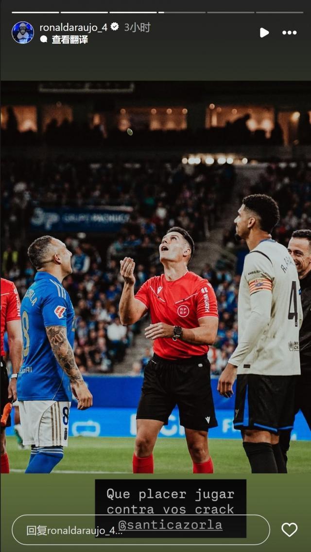 9月26日讯 西甲第6轮比赛,巴萨客场3-1击败皇家奥维耶多。巴萨队长阿劳霍社媒晒出与卡索拉赛前选边的合照,配文:“很高兴与你同场竞技,大师。”