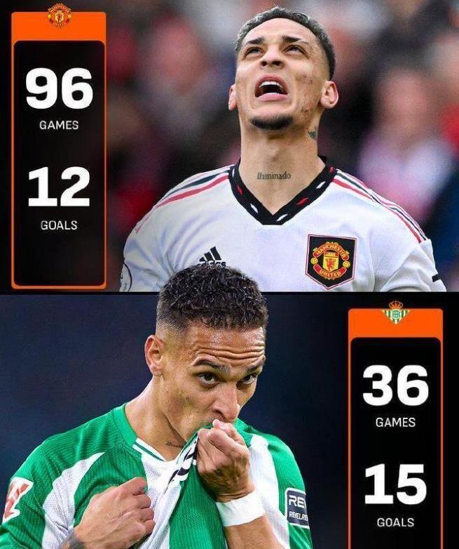眼看着安东尼在皇家贝蒂斯大放异彩,红魔球迷内心是五味杂陈。要知道当初曼联引进这位巴西前锋,可是砸下近亿欧元(9500万欧元)的转会费,但是怎奈安东尼在红魔的表现始终不尽如人意。到目前为止,安东尼代表皇家贝蒂斯出战36场比赛,已经为球队贡献15粒进球。相反安东尼在曼联的三个赛季,96场比赛中只有12球入账。