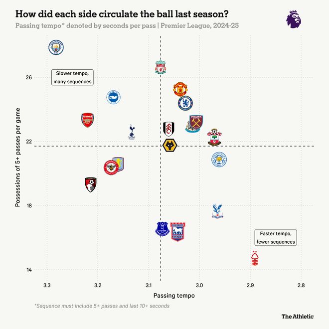 在2024-25赛季英超联赛的两端分别是曼城和诺丁汉森林。前者在瓜迪奥拉执教下的控球风格尽管未能赢得奖杯,依然是联盟中的异类;后者在努诺的带领下虽然控球机会较少,但控球时却能快速而有目的地传递。