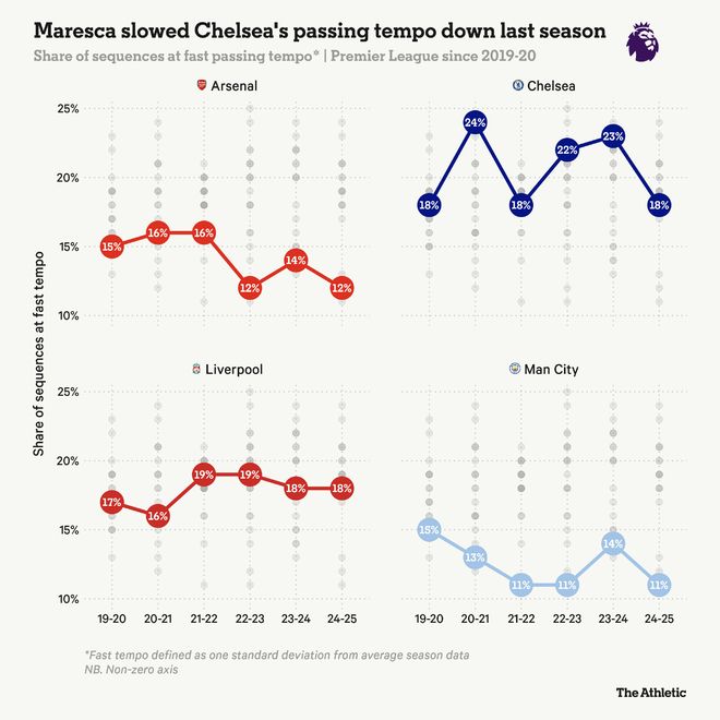 追踪切尔西快速节奏的占比变化,在马雷斯卡执教斯坦福桥的第一个赛季出现显著下降——从波切蒂诺时期的23%降至18%。