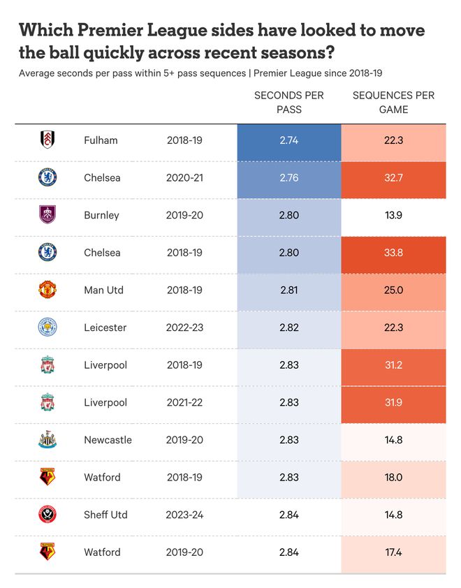 顶尖球队之间差距不大,但富勒姆在2018-19赛季降级的那一年实际上传球速度最快——很可能是一种“烫手山芋”式的踢法,而非刻意的控球。