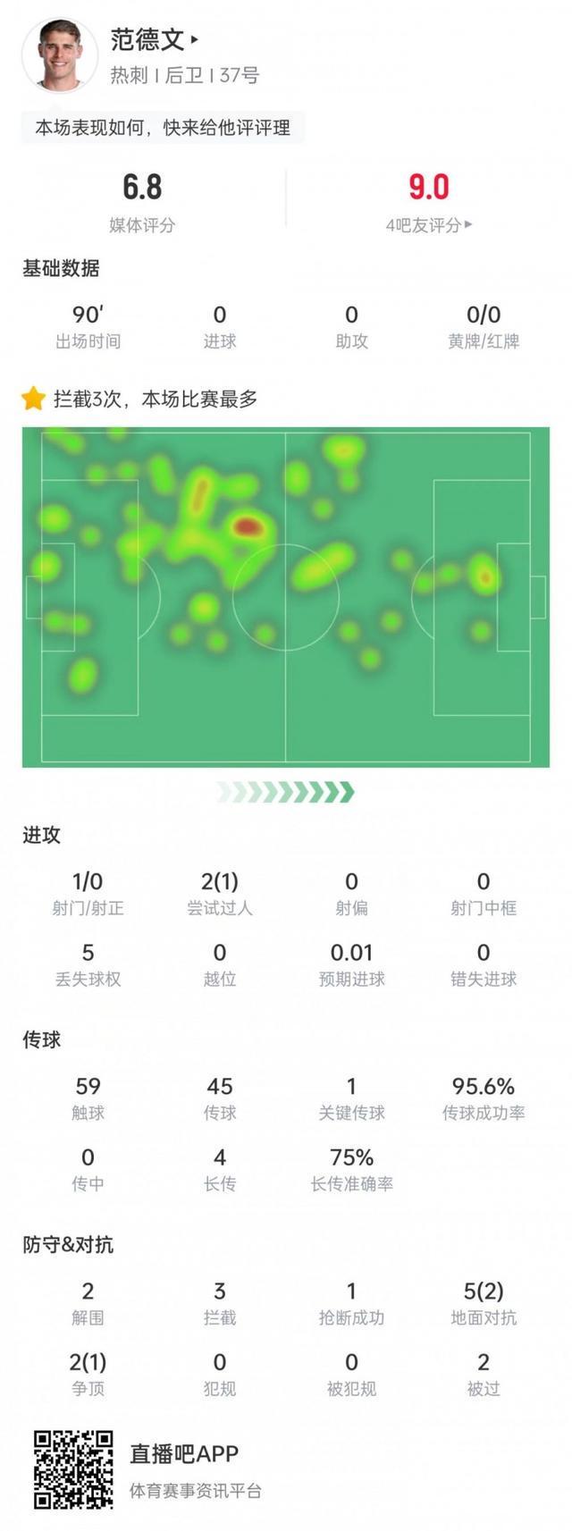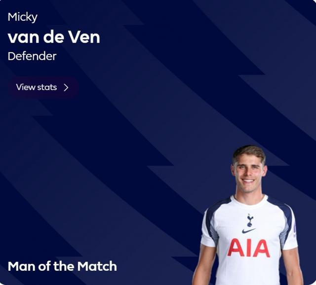 此役范德文为热刺踢满全场,这位中卫当选本场比赛最佳球员。
