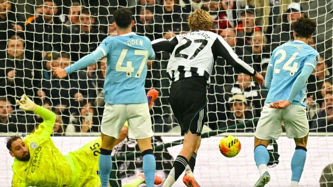 第12分钟,纽卡斯尔第一次威胁曼城的球门,沃尔特马德的头球攻门力量十足,多纳鲁马迅速倒地,做出不可思议的扑救。