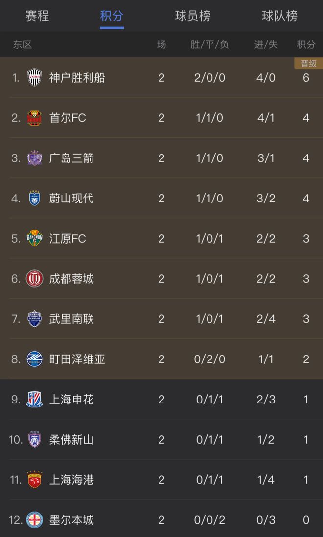 其他球队方面,日本3支参赛队开赛2轮依然不败。神户胜利船取得2连胜,广岛三箭1胜1平,町田泽维亚则是2连平。