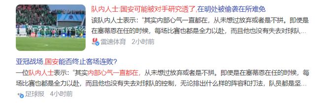 其中一位队内人士透露,北京国安内部心气一直都在,从未想过放弃或者是不拼,即使塞蒂恩在队时,每场比赛也是全力以赴,该人士还同时表示,北京国安之所以变成现在这样,可能是已经被对手研究透了,被针对了,因为北京国安以前都是以我为主,但是现在北京国安在明处,而对手则是在暗处,所以难免被偷袭。